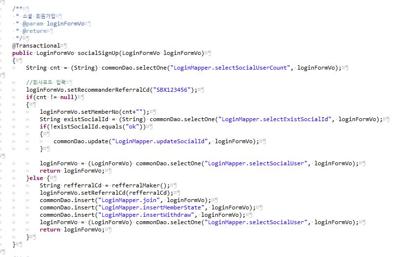 전 회사에서 개발 하던 코드 중 일부를 가져온 것인데, 소셜(카카오, 네이버 등)로 회원가입 하는 고객들에 대한 정보를 저장하고자 하는 내용이다. 위 코드를 나름대로 리팩토링을 해보았는데,